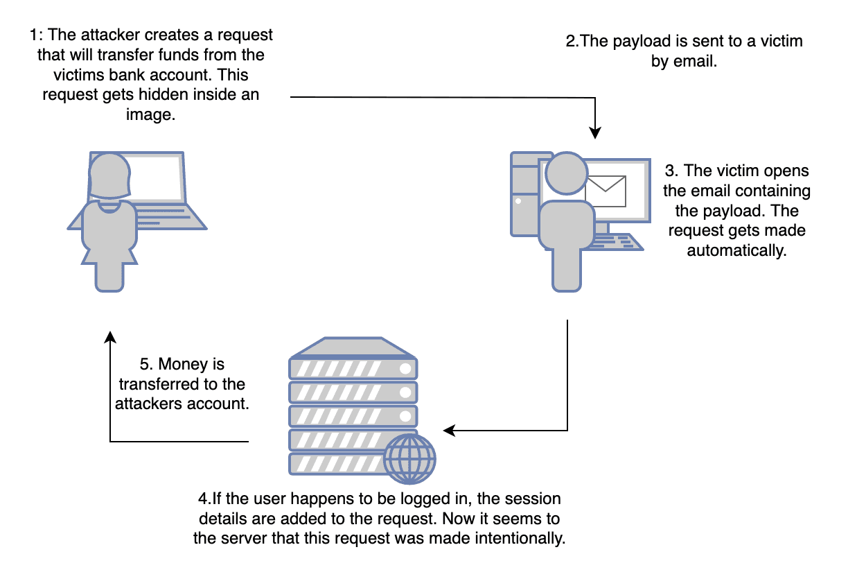 For example: www.greatbank.com/transfer?to=attacker&amount=1000 would transfer a thousand euros to the attackerโs bank account. To make these attacks less suspicious the URLโs can be disguised as an embedded link. Or by inserting the URL into an image.