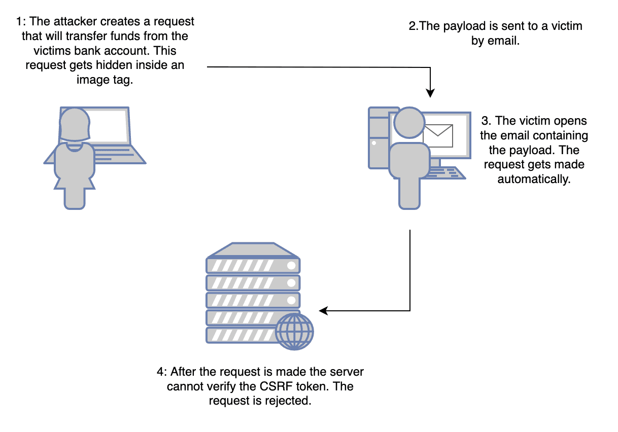 For example <img src=โwww.greatbank.com/transfer?to=attacker&amount=1000โ>. Any medium that tries to load this image will execute the request without the victimโs knowledge as is shown in the picture below.