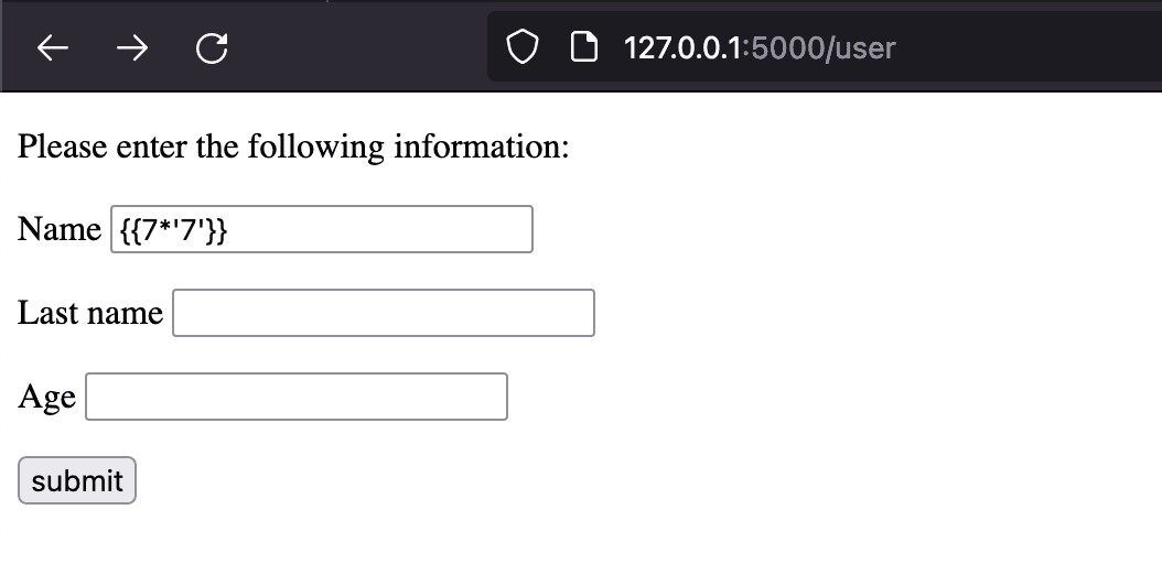 By inserting different payloads it can be found that the page is vulnerable to template injection. It can also be detected that the template engine used is Jinja2 by the way it reacts to the {{7*’7’}} payload.
