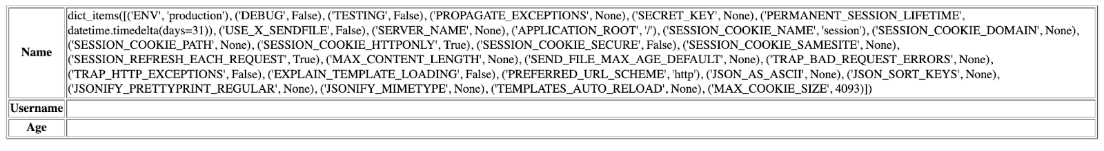 An adversary can use template injection to gain sensitive information, for instance by reading the content of variables or inserting commands that disclose information. By inserting {{config.items()}} in the example page the configuration details can be displayed.