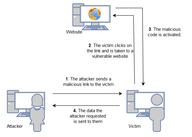 Reflected XSS is wanneer de kwaadaardige payload deel uitmaakt van het verzoek aan een website. Het slachtoffer moet op een link klikken om deze aanval succesvol te laten zijn. Een aanvaller kan proberen een slachtoffer te misleiden om op een link te klikken via e-mail of een ander soort bericht. Nadat het slachtoffer deze website via de kwaadaardige link heeft bekeken, omvat de website deze payload in de reactie terug naar het slachtoffer.
