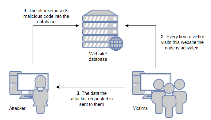 Bewaar XSS, ook bekend als persistente XSS, is een type XSS waarbij het kwaadaardige script op de doelserver is opgeslagen. Nadat het script op een server is opgeslagen, hoeft de aanvaller alleen maar te wachten tot slachtoffers de webpagina met het kwaadaardige script op deze server bekijken. Zodra een slachtoffer deze pagina bekijkt, wordt het kwaadaardige script in hun browser uitgevoerd.